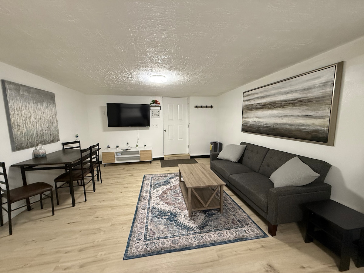Willkommen, hier findest du eine private Einfahrt, die zu deiner eigenen Terrasse mit Sitzgelegenheiten im Freien führt. Im Inneren befindet sich eine neu renovierte, von Boho inspirierte Einheit mit offenem Konzept. Wenn du durch den Küchen-/Essbereich ins Wohnzimmer gehst, findest du eine ausziehbare Couch mit zusätzlicher Bettwäsche und großen Fenstern vor, um die Sonne Alaskas hereinzulassen. Das Schlafzimmer ist mit einem Queensize-Bett, schwimmenden Nachttischen, einem großen Kleiderschrank und Verdunkelungsvorhängen ausgestattet. Schau dir unseren Reiseführer für unsere Lieblingsaktivitäten und Restaurants an!