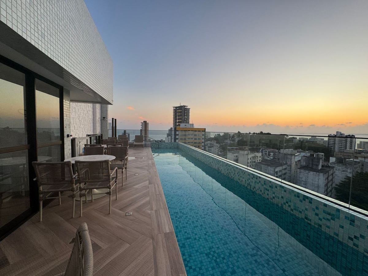 Uma das maiores unidades do Spot Barra, acomoda até 4 pessoas com conforto. Com vista mar frontal, sendo o mais alto e com uma vista ampla para o Cristo e toda Avenida Oceânica até o Farol da Barra. Prédio moderno com piscina, academia, Seven Wonders Restaurante no terreo que serve um delicioso e disputado café da manhã (pago), minimercado, recepção 24h e arquitetura deslumbrante. Ideal para quem busca sofisticação, vista incrível e fácil acesso às melhores atrações de Salvador.