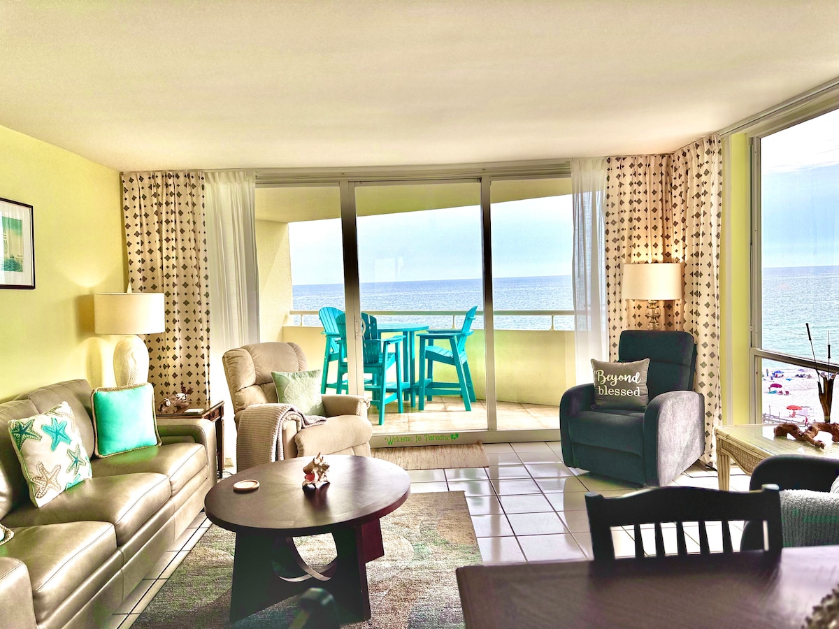 Deine Familie wird unsere familienfreundliche Wohnung im 4. Stock direkt am Strand mit Blick auf den Golf genießen! Die Kinder werden ihren Etagenbettbereich mit einem Muschel-Austauschschrank lieben. Das Hauptschlafzimmer verfügt über ein neues Kingsize-Bett und einen Fernseher. Der Wohnbereich verfügt über einen Panoramablick auf den Strand mit viel natürlichem Licht. Die voll ausgestattete Küche öffnet sich zum Wohnbereich mit einer Theke mit 4 Hockern und einem Esstisch. Dein privater Balkon ist perfekt für Morgenkaffee, Entspannung oder Sonnenuntergänge!