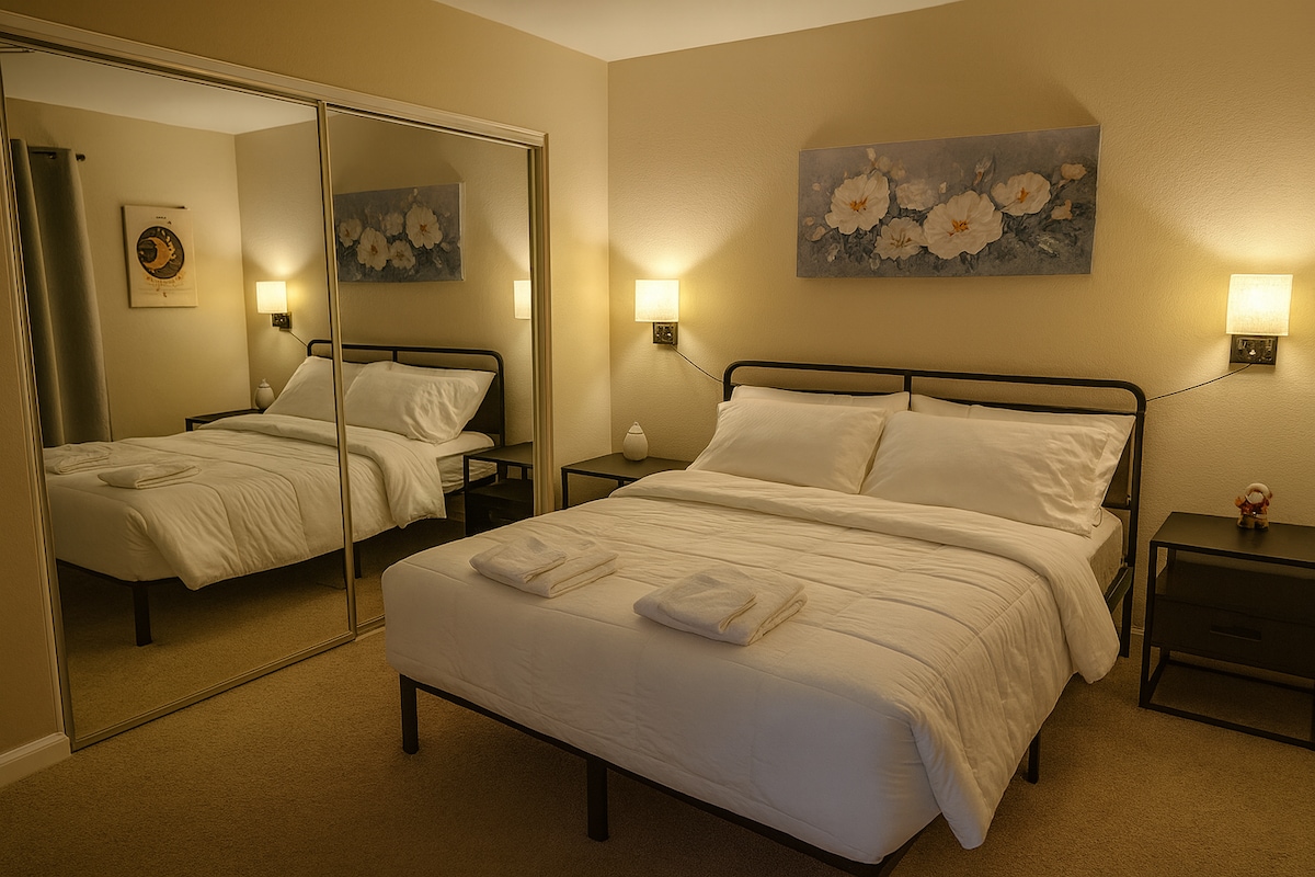 Übernachte in unserem ruhigen Zuhause in der Gegend von Foothill Farms in Sacramento! In der Nähe der I 80 Fwy und weniger als 20 Minuten von Krankenhäusern und Einkaufszentren entfernt. Target & Walmart und eine Vielzahl von Restaurants (In-n-Out, Chick-fil-A, Sushi, etc.) 13 Meilen/20 Minuten vom Flughafen Sac Es handelt sich um eine umgebaute 2-Bett-1-Bad-Maisonette-Wohnung mit geräumigem Wohn- und Schlafzimmern. Neue Küche und Essbereich. Das Wohnzimmer verfügt über eine bequeme Couch, einen 55-Zoll-Smart-TV und ein helles Ambiente. Zimmer 1 mit Kingsize-Bett und Puffy Luxe-Matratze Zimmer 2 Queensize-Bett mit fester Matratze, Arbeitsbereich