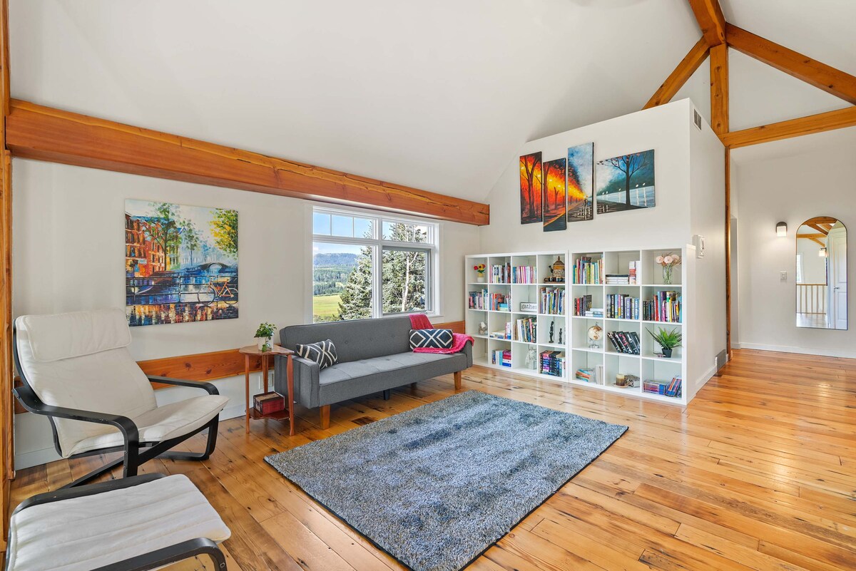 Willkommen im Rolling Hills Retreat! Entdecke das ländliche Alberta vom Feinsten! Ideal für Familien oder Gruppen von bis zu 15 Personen. Mit wunderschönem Holzrahmen, atemberaubendem Blick auf die Landschaft und einem Whirlpool zum Entspannen ist es ein wahrer Rückzugsort. Genieße im Winter den Nervenkitzel des Schneemobilfahrens direkt auf dem Grundstück! Kinder werden den Spielplatz, das Trampolin und das gemütliche Spielzimmer im Inneren lieben. Egal, ob du einen ruhigen Rückzugsort oder einen warmen Ort suchst, um dich mit deinen Lieben zu treffen - diese Unterkunft bietet alles, was du für einen unvergesslichen Aufenthalt benötigst.