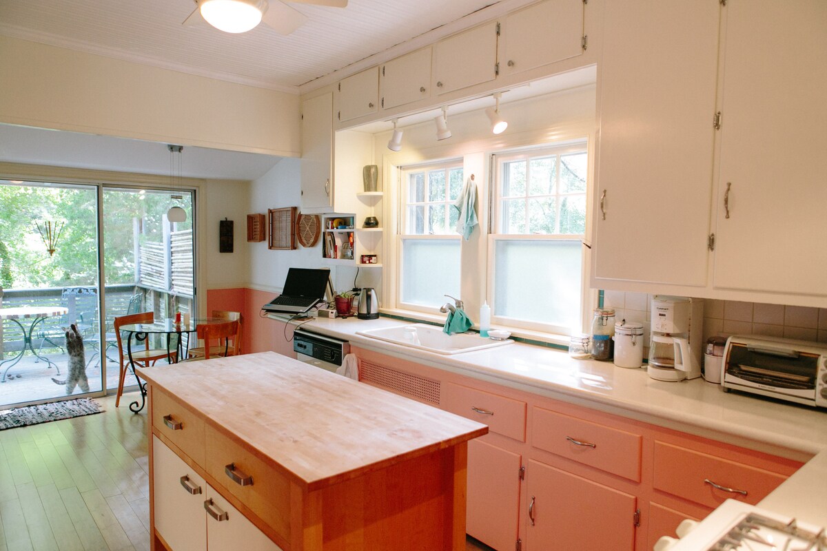 Ich habe mein Haus in eine Maisonette verwandelt, indem ich eine sehr 70er Jahre in einen privaten, gemütlichen und charmanten Raum verwandelt habe. Es gibt eine Küchenzeile, einen Essbereich und eine Sitzecke, ein Schlafzimmer und ein Badezimmer. Die Lage wäre ideal für jemanden, der einen schnellen Zugang zum Duke Regional Hospital (4 Minuten entfernt) oder der Innenstadt (6 Minuten) benötigt, oder für jemanden, der eine laufende Gewohnheit halten möchte (der Greenway ist in der Nähe). Eine Taqueria, ein Lebensmittelgeschäft und ein Café sind zu Fuß erreichbar.