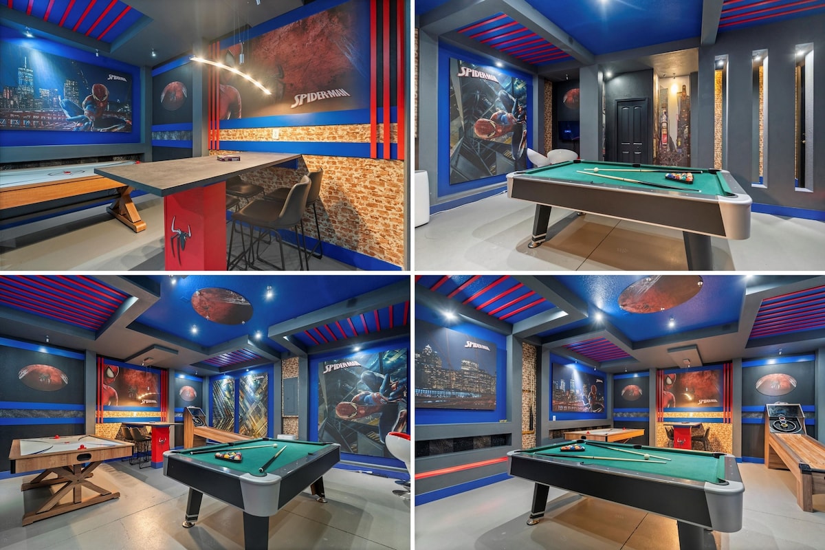 Die perfekte Balance aus STILVOLLEM DESIGN, LUXURIÖSEM KOMFORT und ENDLOSER UNTERHALTUNG im atemberaubenden 3,5 Quadratmeilen großen Reunion Resort. Du hast deinen eigenen privaten Pool, Spa, Heimkino – Spielzimmer, 3 Master-Suiten, 3 unglaubliche Themen-Schlafzimmer (MARVEL, FROZEN II, NASA) für Kinder oder Erwachsene, die neueste Xbox Series X-Spielstation, ein 2500 ft2 großes Pool-Deck mit Blick auf einen schönen Wald und Teich, Feuerstelle und Billardtisch, nur wenige Minuten von Disney entfernt.