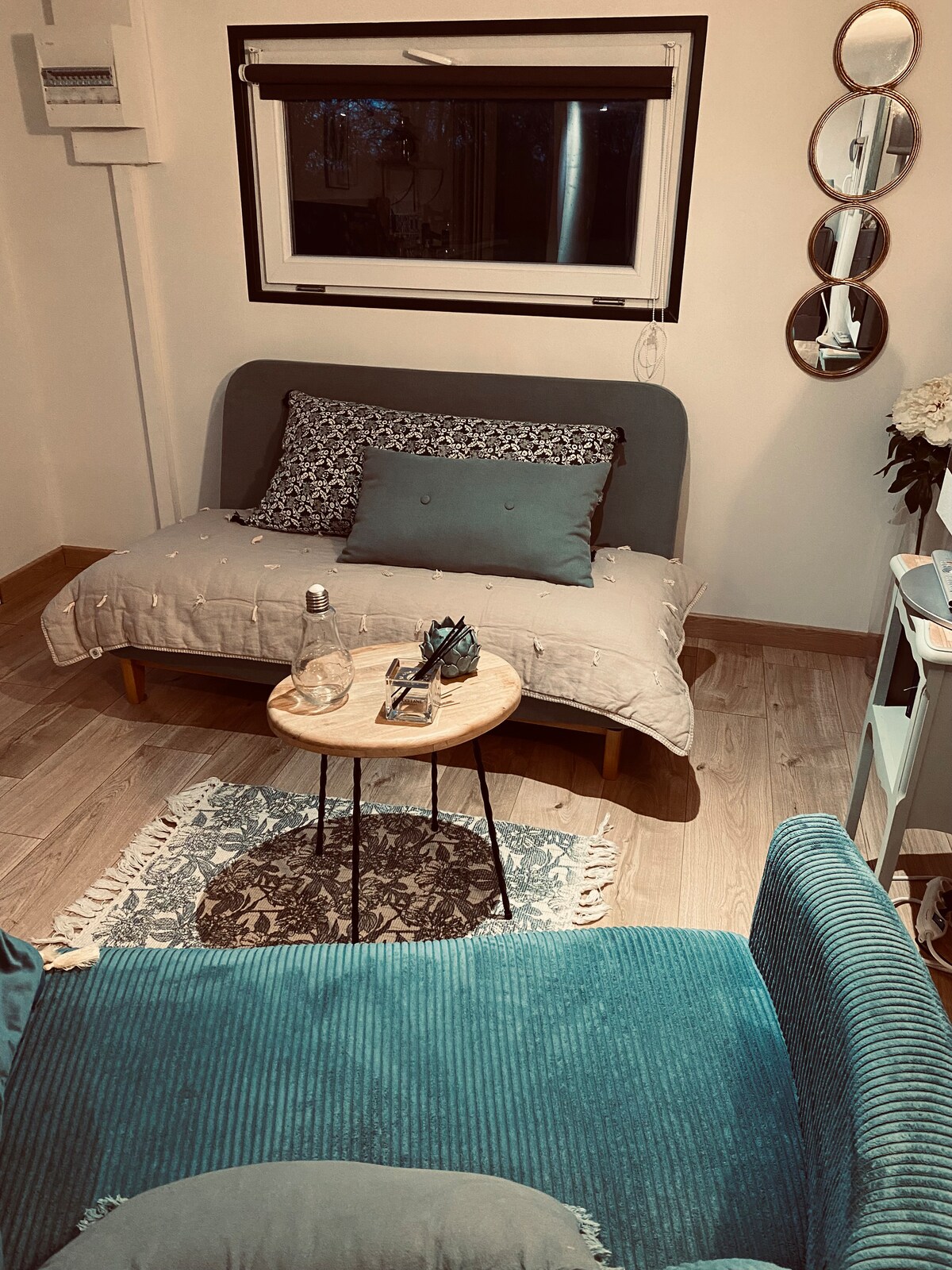 Wir bieten Ihnen unser kleines Gästehaus von 30 m2 am Ende des Gartens, komfortabel: Schlafzimmer mit Bett 140, Bad mit Dusche, Einbauküche, kleines Wohnzimmer mit Schlafsofa. Ideal für 2-3 Personen. Achtung! Wir sind im Tiny House-Modus, die Decke ist nicht hoch, kompliziert für Menschen über 1,95 m! Es hat eine schöne Terrasse mit Grill und Mollkye, ohne Gegenüber. Ich stelle Tee und Kaffee für Ihre Ankunft zur Verfügung, das Bett wird gemacht.