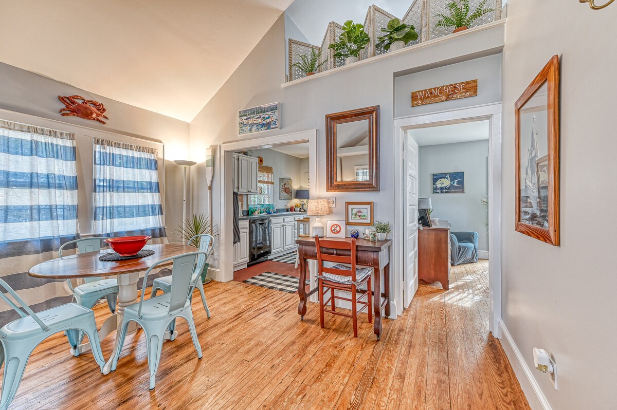 Bezauberndes Ferienhaus mit SPEKTAKULÄRER Aussicht! Das Hotel liegt in einer ruhigen Sackgasse im Herzen von Hatteras Village. Es gibt so viel zu tun, aber die Aussicht ist so toll, dass du vielleicht nicht mehr gehen möchtest. Auf der anderen Straßenseite gibt es ein privates Flachwasserdock für ein Boot mit geringem Tiefgang, zum Schwimmen, Angeln, Kajakfahren und Paddelboarding. Hatteras Strand ist nur eine kurze Fahrt oder Radtour entfernt. Zugang zum Sound für Kiteboarding im Frühling und Herbst. Dieses Ferienhaus hat einfach alles! Neue Waschmaschine/Trockner, Geschirrspüler, Farbe!
