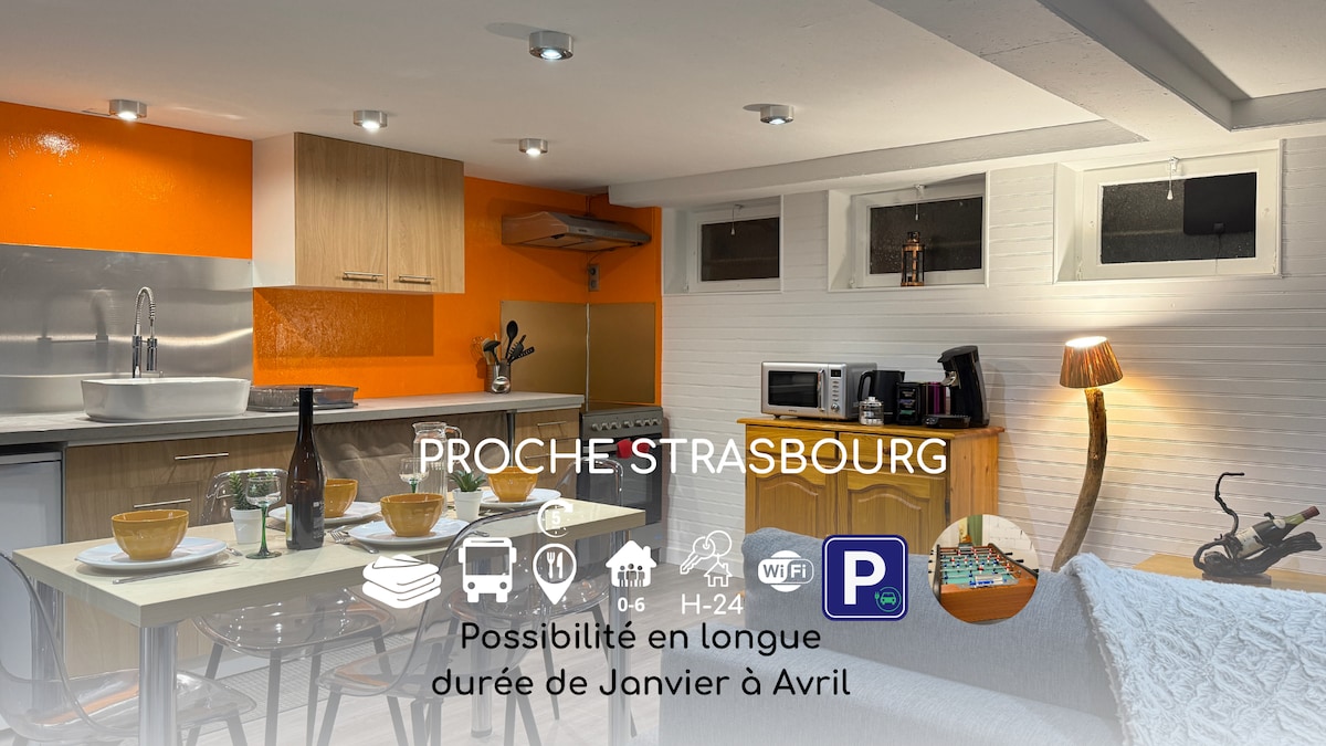 Neues Studio von 20 m2, völlig unabhängig und angrenzend an ein Haus in einem ruhigen Wohngebiet. Ideal für Ihre Geschäftsreisen oder um die Region mit direktem Zugang zu Straßburg und der Autobahn zu besuchen. (Stadtzentrum 15 Minuten mit dem Auto). Hier finden Sie alles, was Sie für einen angenehmen Aufenthalt benötigen. Ideal für ein Paar oder eine Einzelperson. Parkplatz direkt vor der Tür.