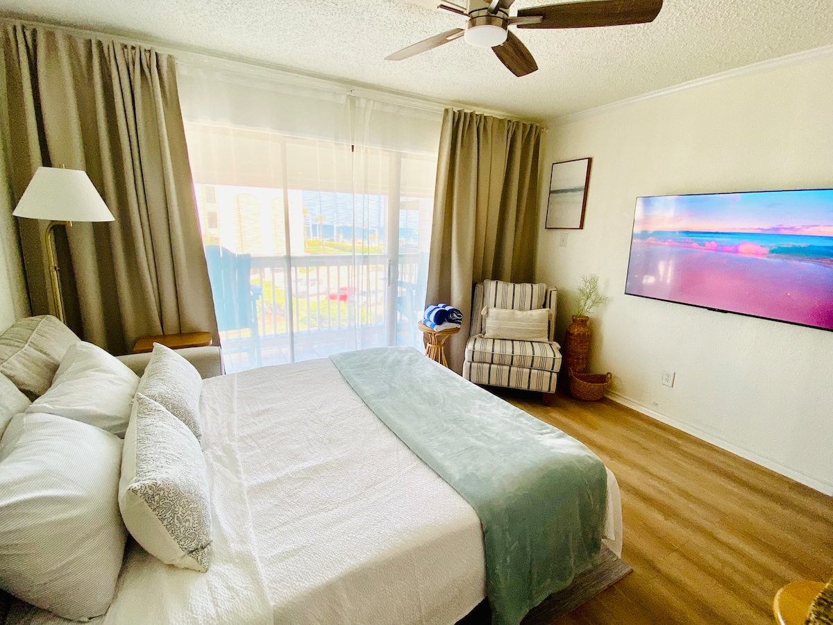 Diese beliebte Eck-Studio-Wohnung am Strand zwischen Stewart Beach und East Beach verfügt über einen großen Balkon und einen weitläufigen Blick auf den Golf. Es ist gut ausgestattet für zwei oder für eine Auszeit allein. Das Resort bietet Pool und Pickleball! Keine Straße zu überqueren, um zum Strand zu gelangen, aber die Wohnung liegt in der Nähe der Innenstadt von Galveston und der Seawall. Genieße die wunderschönen Sonnenaufgänge und die Mondbeobachtung, verfolge das Kommen und Gehen von Kreuzfahrtschiffen, schau dir die Aktivität am Strand an, schwimme im beheizten Pool oder entspanne dich und beobachte die Wellen!