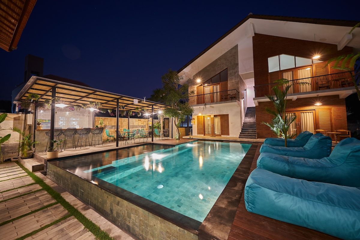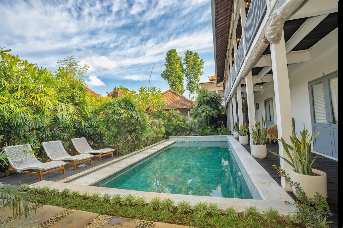 Erlebe deine 130 m² große Villa, die japanischen Minimalismus, peranakanisches Erbe und balinesische Wärme vereint. Genieße absolute Privatsphäre mit gemütlichem Wohnzimmer, Speisekammerküche, 2 Badezimmern mit Badewannen und privatem Pool mit Liegestühlen. Die einzigen Gemeinschaftsräume sind unser ruhiger Garten mit einem majestätischen Baum neben einem traditionellen balinesischen Gebetsstein. Perfekt für bis zu 3 Gäste. Jedes Detail verbessert deine Verbindung zu Balis ruhiger Umgebung.