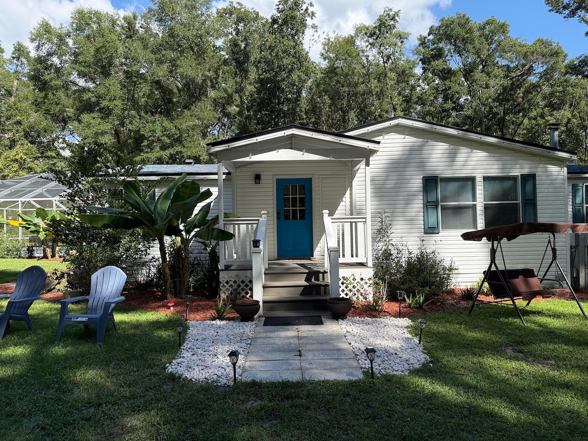 Wir befinden uns neben dem Rum Island Park, der eine Schwimmquelle, Kajak- und Kanu-Abhol-/Anlegestelle/Bootsrampe bietet. Es ist ein privates Ferienhaus. 1 Schlafzimmer, 4 Schlafplätze. 1 Schlafzimmer mit einem Schlafsofa. Du wirst meine Unterkunft lieben wegen die Lage. Der Fluss ist im Hinterhof. Du kannst dein persönliches Kanu oder Kajak zu Wasser lassen. Setz dich an die Feuerstelle oder genieße die Terrasse und koche mit Freunden und Familie. Wir haben aufgrund unserer Allergien eine Keine-Haustiere-Richtlinie. Die Städte High Springs und Gainesville sind in der Nähe.