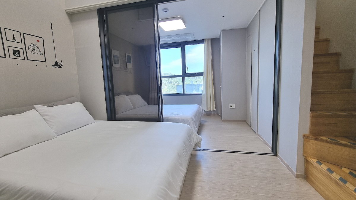 # Gangneung Ocean Stay # Meerblick aus der Höhe # für 4 Personen # Meerblick vom Bett aus. Sonnenaufgang beobachten.