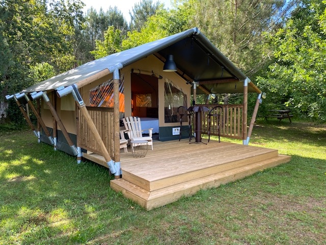 Glamping, ungewöhnlich für einen Familien-/Verliebtenaufenthalt. In der Nähe von Wald, Meer, schönen und riesigen Stränden, Schwimmen und Surfen ideal (Gurp, Soulac, Montalivet...) Ruhig, in seiner grünen Umgebung "Cabane et Toile" hat eine große Holzterrasse mit Pergola, die zum Entspannen einlädt. Das CHALET mit seiner schönen ausgestatteten Küche und einem separaten Bad/ WC sorgt für einen originellen und sehr komfortablen Aufenthalt! Die geräumige und gemütliche TOILE bietet 4 Schlafplätze in einer Bohème-Atmosphäre. wlan