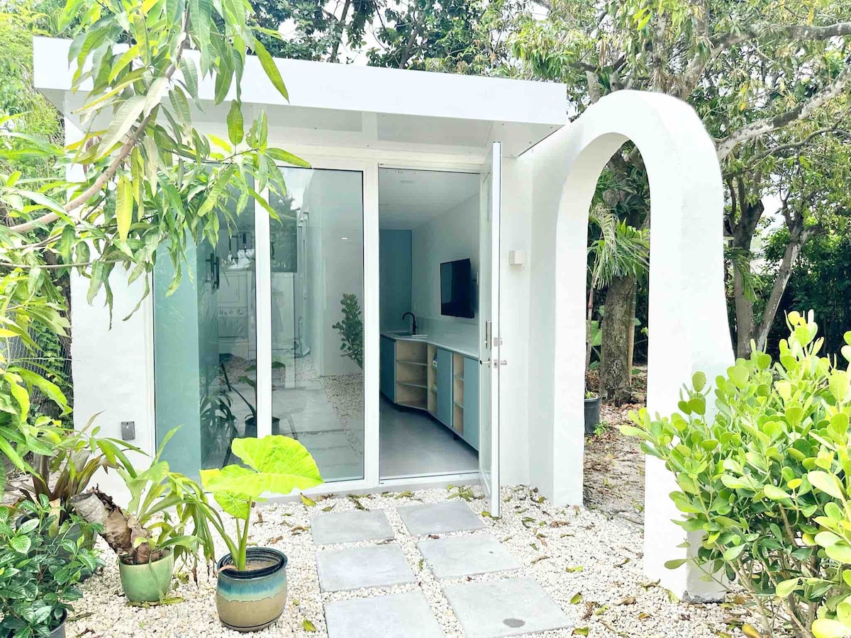 This modern studio is a detached guesthouse behind an original 1925 residence in South Miami. During recent renovation, a modern Miami aesthetic was designed to blend with its thoughtfully-preserved art deco essence. This 225 SF alternative to a hotel room is ideal for 1-2 guest and features a queen murphy bed, kitchenette, sleek bathroom and a lush private courtyard.