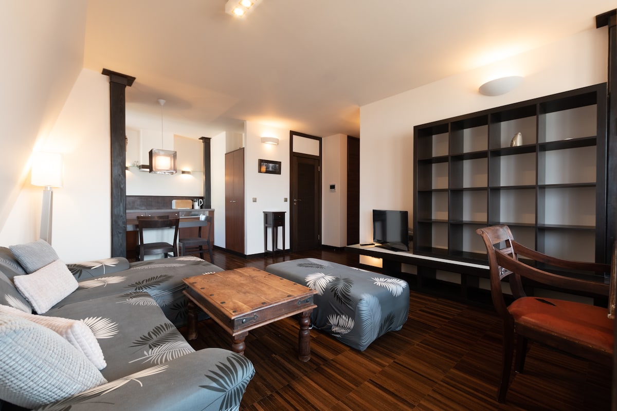 Stilvolle Wohnung mit einem separaten Schlafzimmer und einer Tiefgarage, die im Preis enthalten ist. Der hohe Standard ermöglicht einen angenehmen Aufenthalt. Wir bieten ein komfortables Bett, Smart-TV, schnelles WLAN, eine voll ausgestattete Küche, Bettwäsche und Handtücher. Die Wohnung hat einen großen Balkon und liegt weit von belebten Straßen entfernt. Es gibt ein Lebensmittelgeschäft im Gebäude, es gibt auch Einkaufszentren (Blue City, Reduta) und Restaurants in der Nähe. Nur 400 m zum Schnellbahnhof der Stadt
