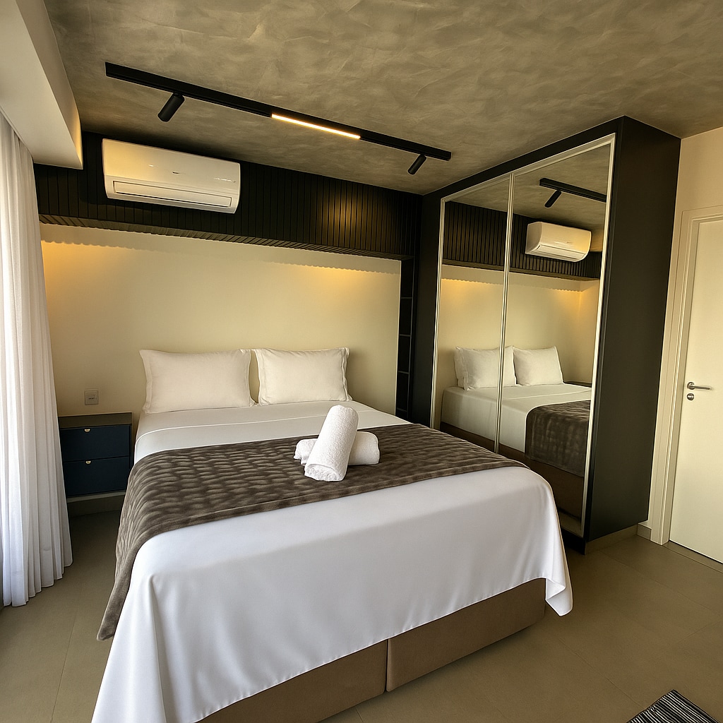 Apartamento moderno e aconchegante no coração da cidade. Desfrute de uma estadia confortável e elegante neste apartamento totalmente mobiliado, com design contemporâneo e acabamento de alto padrão. O espaço conta com uma sala acolhedora com TV e ar-condicionado, quarto com cama queen, banheiro moderno, cozinha completa e área de trabalho ideal para home office. Perfeito para quem busca praticidade e conforto, seja para curtas ou longas estadias.