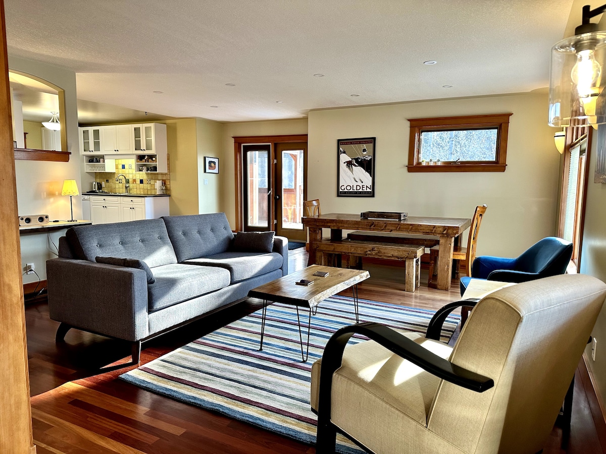 Willkommen in dieser modernen, geräumigen Suite mit wunderschöner Sicht von jedem Fenster der spektakulären Bergketten von Golden und dem legendären Kicking Horse Mountain Resort. Die Terrasse mit Blick auf einen ruhigen Park und das Stadtzentrum ist nur einen kurzen Spaziergang entfernt, über eine einzigartige Holzrahmen-Fußgängerbrücke, ebenso wie malerische Rad- und Wanderwege. Bereite ein Getränk an der Kaffeebar zu und entspanne dich neben dem großen Stein- und Gaskamin nach einem Tag Skifahren oder Abenteuer. Komm und übernachte bei uns und erlebe Golden. 00002703