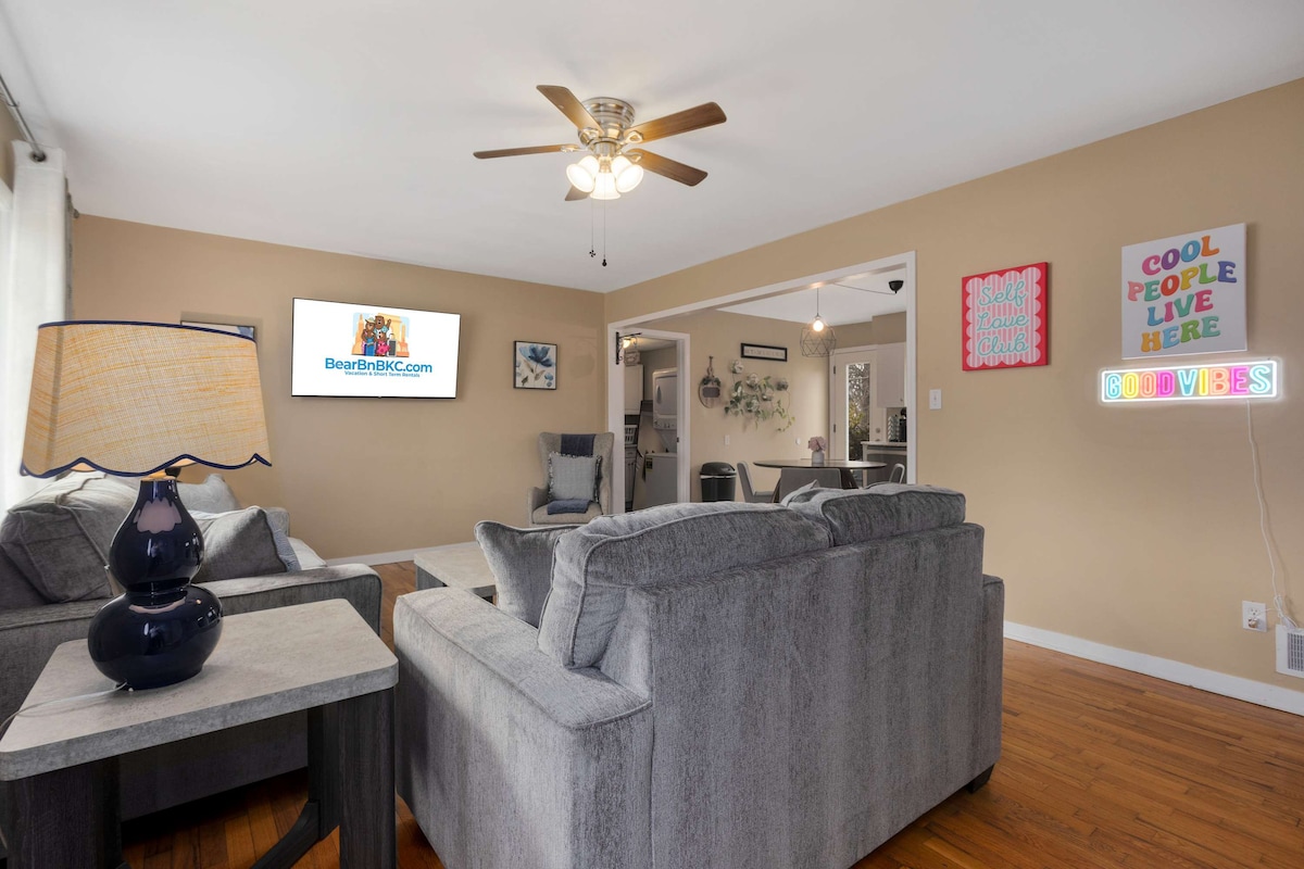 Ruhige Gegend günstig in der Nähe von KC-Attraktionen gelegen! Wir bieten ein geräumiges, gut beleuchtetes zweites Zuhause. Unsere gut ausgestattete Küche verfügt über eine Glasschiebetür, die zu unserem geräumigen Hinterhof mit einer Terrasse führt, auf der Freunde und Familie grillen können und wo Kinder auf ihrem eigenen Spielplatz spielen können. Das Hauptschlafzimmer verfügt über ein Kingsize-Bett und ein angeschlossenes Badezimmer. Unser Queensize-Bett, ein lustiges 3-Etagenbett und 2 Futonbetten im Wohnzimmer bieten Gästen viele weitere Schlafmöglichkeiten! Hinweis: Wir akzeptieren keine lokalen Gäste.