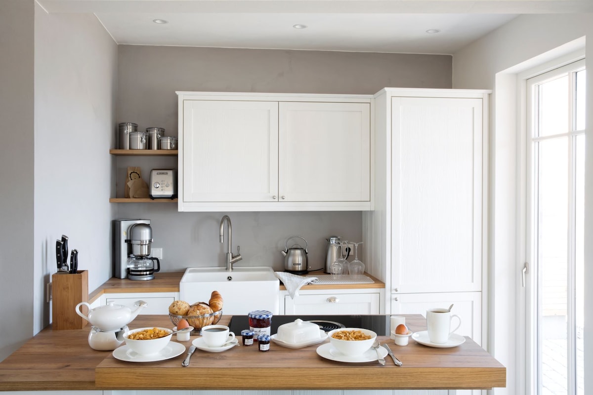 Genießen Sie modernes Design mit traditionellem Charme des alten Dreiseithofes mit Ostseeblick sowie Strandzugang über eigenes 3 Hektar Grünland Die Ferienwohnung "Über der Remise" im Hof Nieby bietet einen besonderen Ausblick, der weit reicht zur Ostsee sowie über das üppige Grün des Naturgrundstücks. Moderne tiefliegende Fenster sorgen für eine lichtdurchflutete Atmosphäre, die durch den offenen Wohnbereich ergänzt wird. Eine zusätzliche Schlafnische wird über eine Leiter erreicht.