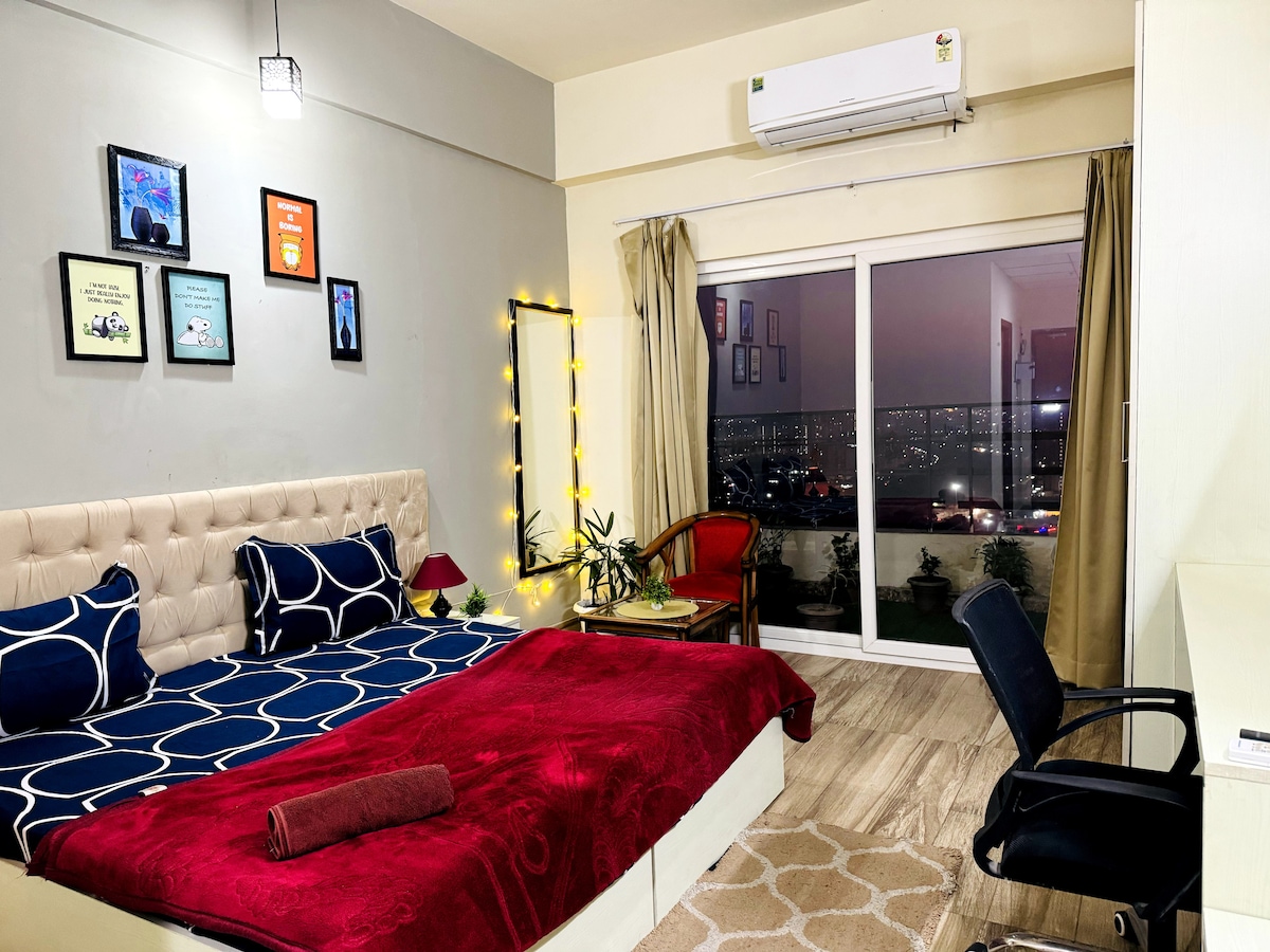 Eine voll möblierte, stilvolle, luxuriöse Studiowohnung mit einer schönen Aussicht auf eine malerische grüne Landschaft tagsüber und die Lichter der Stadt nachts. Perfekter Ort zum Entspannen und Erholen für Geschäftsreisende, Studenten oder Paare. High-Speed-Internet ist verfügbar und kann Remote-Arbeit unterstützen. Kostenlose, sichere Parkplätze stehen auf dem Gelände zur Verfügung. Wir befinden uns innerhalb von 5 Fahrminuten vom Expo Mart, 8 Minuten vom Pari Chowk und dem Jaypee Resort entfernt. Hausgemachtes Essen ist verfügbar.