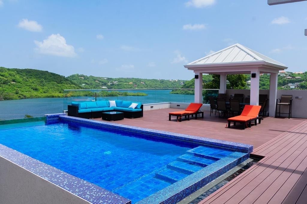 Der Turtleback-Pavillon im Reef View Pavilions ist eine private Suite im spanischen Stil mit einem privaten, funkelnden blauen Swimmingpool, einem erstaunlichen Pavillon auf dem Dach und mehreren privaten Außenbereichen mit Wohnbereich im karibischen Stil. Entspannen Sie sich unter dem Pavillon auf dem Dach und auf der sonnigen Bräunungsterrasse. Die Hauptebene besteht aus schönen, überdachten Veranden, Schlafzimmer- und Wohnräumen und einer Küchenzeile, die in einem offenen Raum gestaltet sind.