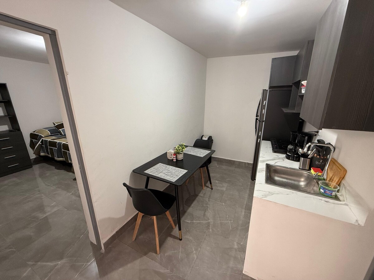 Entdecken Sie unsere Wohnung, bis zu 4 Personen Mit 2 Doppelzimmern, Einzelschlafsofa und Klimaanlage, garantieren wir einen angenehmen Aufenthalt. Genießen Sie ein komplettes Bad, eine Küche mit Kaffeemaschine, Mixer, Herd, Mikrowelle, Utensilien und einen großen Kühlschrank. Strategisch gelegen: nur 5 Autominuten vom BBVA-Stadion, Domo Care, 20 Minuten vom Fundidora Park, Arena Monterrey, Banorte-Stadion, 30 Minuten vom Flughafen entfernt. Der ideale Ausgangspunkt, um die Gegend zu erkunden und das Beste zu genießen! TKS
