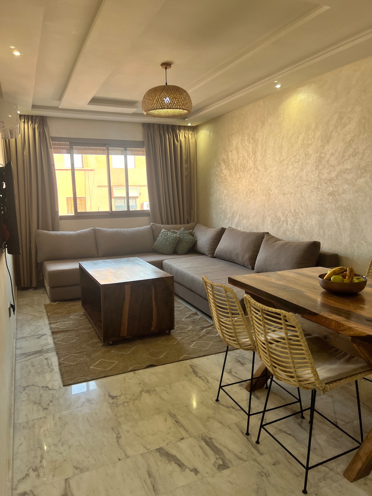 Moderne, helle Wohnung im Herzen von Gueliz. Smart-Lock-Eingang, stilvolles Wohnzimmer mit TV, ausgestattete Küche, 2 elegante Schlafzimmer und ein Steinbad mit einer „Wasserfall“-Dusche. Gehweite: 📌 Entfernungen von: • 🕌 Platz Djemaa el Fna – 10 Min. • 🌴 Majorelle-Garten/YSL-Museum – 5 Min. • 🏰 Bahia-Palast – 15 Min. • 🕌 Medina / Souks – 10 Min. • ✈️ Flughafen Marrakesch-Menara – 12 Min. • 🛍️ Carre Eden / Starbucks – 3 Minuten • 🍽️ Restaurants & Cafés – direkt vor der Haustür
