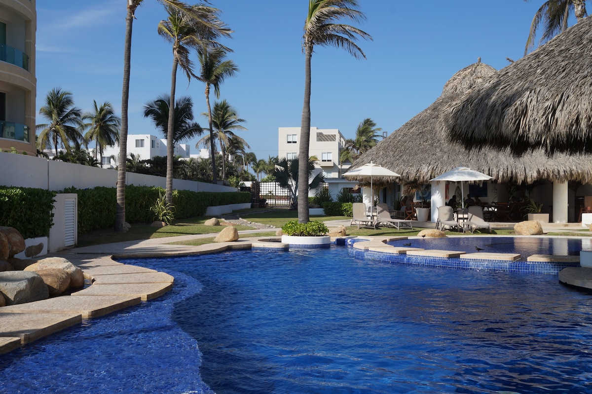 ** NIEDRIGE PREISE FÜR KLEINGRUPPEN. Bitte erkundige dich.** Dies ist eine elegante und geschmackvolle Strandwohnung in Real Diamante mit direktem Strandzugang und einer großen privaten Terrasse. Luxus-Wohnung in einem niedrigen Gebäude mit direktem Zugang zum weißen Sandstrand. Große Terrasse mit Panoramablick auf das Meer und Tauchbecken. In der Diamante-Region von Acapulco gelegen – Sicher, Schön, Luxuriös – 3 Infinity-Pools.
