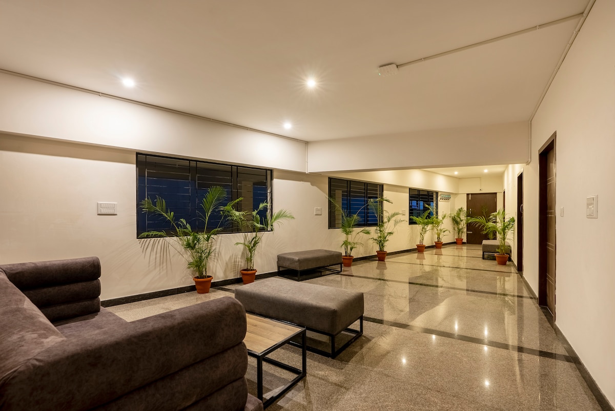 Genieße einen Premium-Aufenthalt in dieser modernen Unterkunft mit einem kleinen Vorgarten. Gemütlich und ruhig, ideal für Paare, Alleinreisende oder Geschäftsreisende. In der Nähe der wichtigsten IT-Zentren von Bangalore an der Outer Ring Road, darunter RMZ Ecoworld, Embassy TechVillage, RGA Tech Park und mehr, verbindet es Komfort und Zugänglichkeit. Ob für Arbeit oder Entspannung, du findest einen ruhigen Rückzugsort in der Nähe von Büros und Stadtleben. Es wurde im September 2025 eröffnet und ist neu auf Airbnb, aber vollständig auf einen warmen, einladenden Aufenthalt vorbereitet.