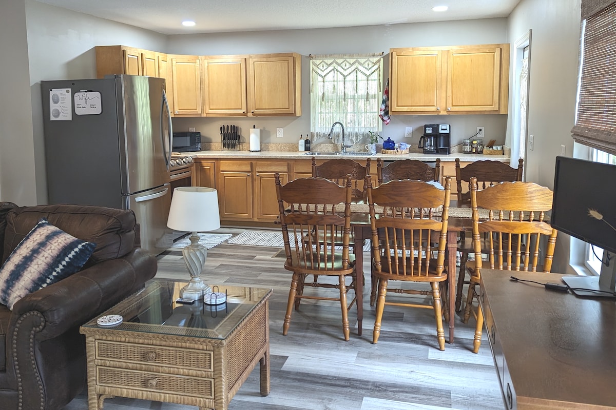 Riverbend Retreat bietet luxuriösen und gemütlichen Komfort am Suwannee River. Genieße den direkten Zugang zum Fluss, einen privaten Steg zum Angeln und Bootfahren sowie kostenlose Kajaks zum Erkunden. Das Apartment mit einem Schlafzimmer verfügt über eine voll ausgestattete Küche, eine luxuriöse Einrichtung, ein ausziehbares Sofa und eine eigene Terrasse mit Blick auf das Wasser. Entspanne dich an der Feuerstelle unter den Sternen. Haustierfreundlich und in der Nähe von Parks und Städten gelegen, ist es der perfekte Ort, um sich zu entspannen und wieder mit der Natur zu verbinden.