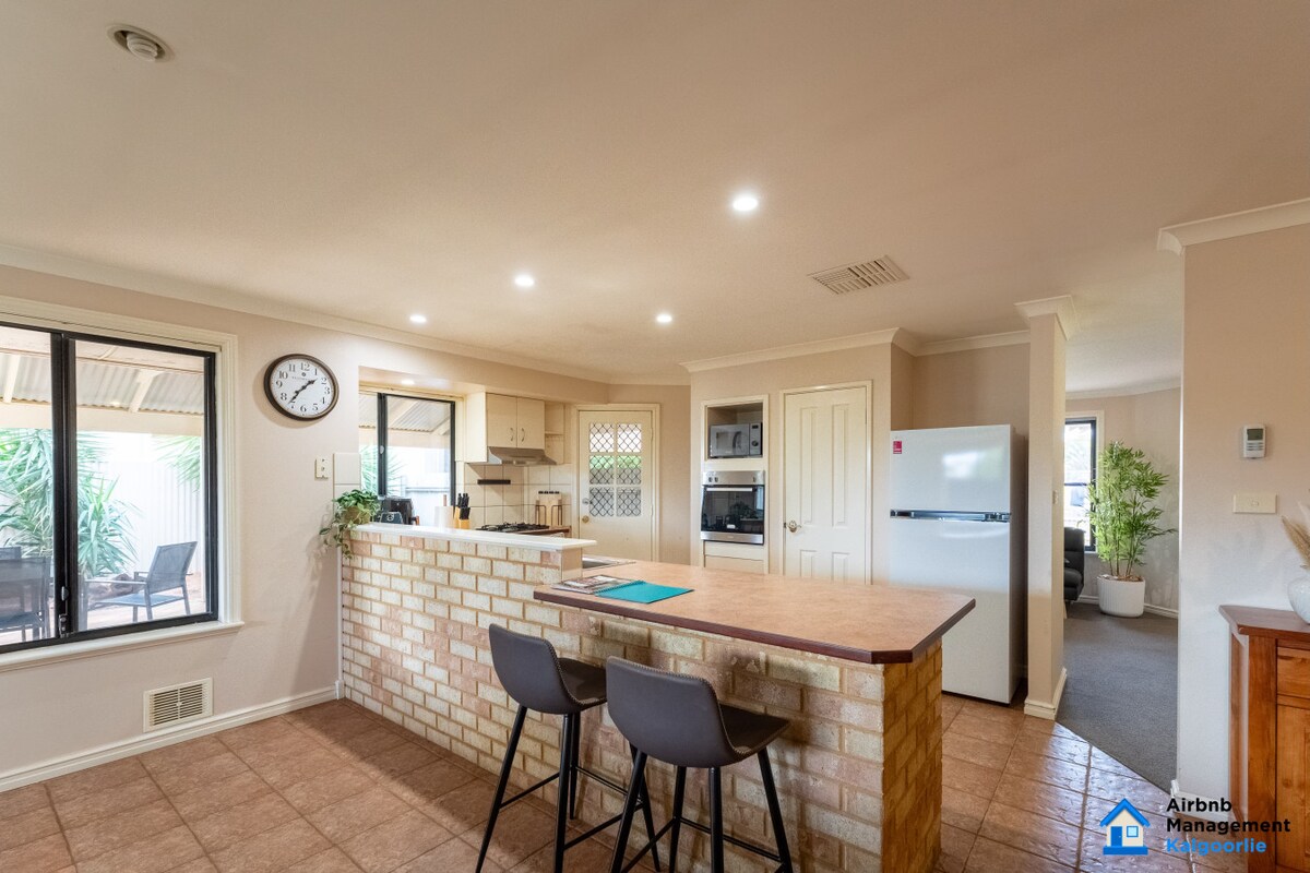 Wir haben unser Zuhause für reisende Arbeiter und Familien eingerichtet – unser modernes Zuhause bietet die ideale Mischung aus Komfort und Bequemlichkeit! Jedes Zimmer verfügt über ein Queensize-Bett, eine Klimaanlage und Bettwäsche in Hotelqualität, um einen erholsamen Schlaf zu gewährleisten. Zentral gelegen, findest du es nur eine 2-minütige Fahrt von Kalgoorlies beliebtestem Drive-Through-Café, „The Proper Gander“, sowie dem CBD, Coles, Kmart, lokalen Metzgern, Apotheker, Oasis Gym & Recreation Centre und Take-Away-Optionen entfernt.