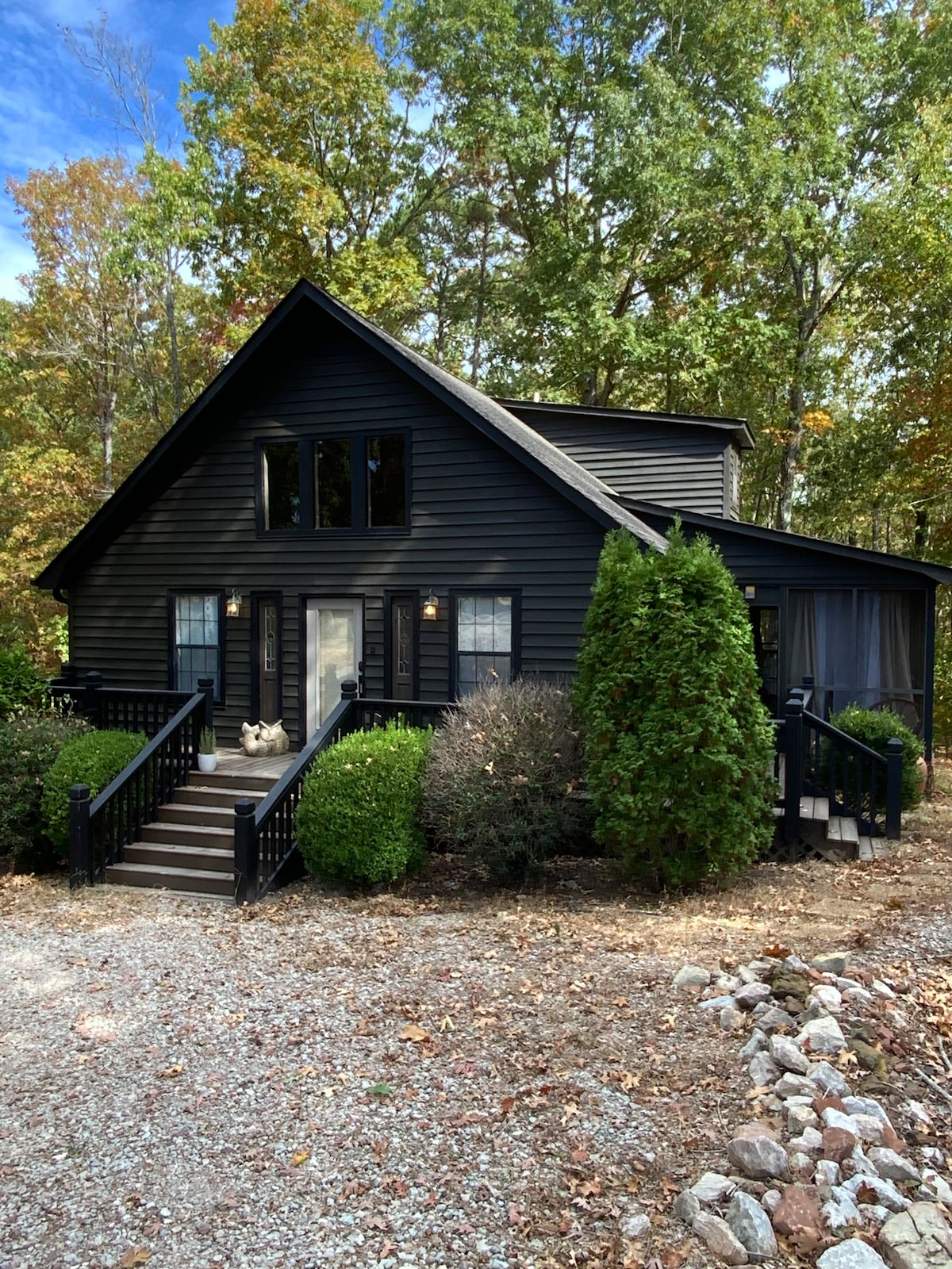 Ruhig, privat, friedlich... Unsere Hütte liegt auf einem kleinen Hügel und befindet sich in einer großartigen Nachbarschaft von freundlichen Familien. Sie liegt nur wenige Minuten von Grand Harbor Marina, State Park Marina und Aqua Marina entfernt. Viel Natur zum Kommen und Genießen!! Wir haben einen Kamin für gemütliche Nächte, kostenloses WLAN, eine voll ausgestattete Küche und eine Waschmaschine/einen Trockner. Keurig für Kaffeeliebhaber. Umlaufende Veranda zum Sitzen und Entspannen nach einem langen Tag auf dem Wasser. Privater Whirlpool zum Entspannen (muss Verzichtserklärung unterschreiben). In der Nähe von Restaurants und Geschäften.
