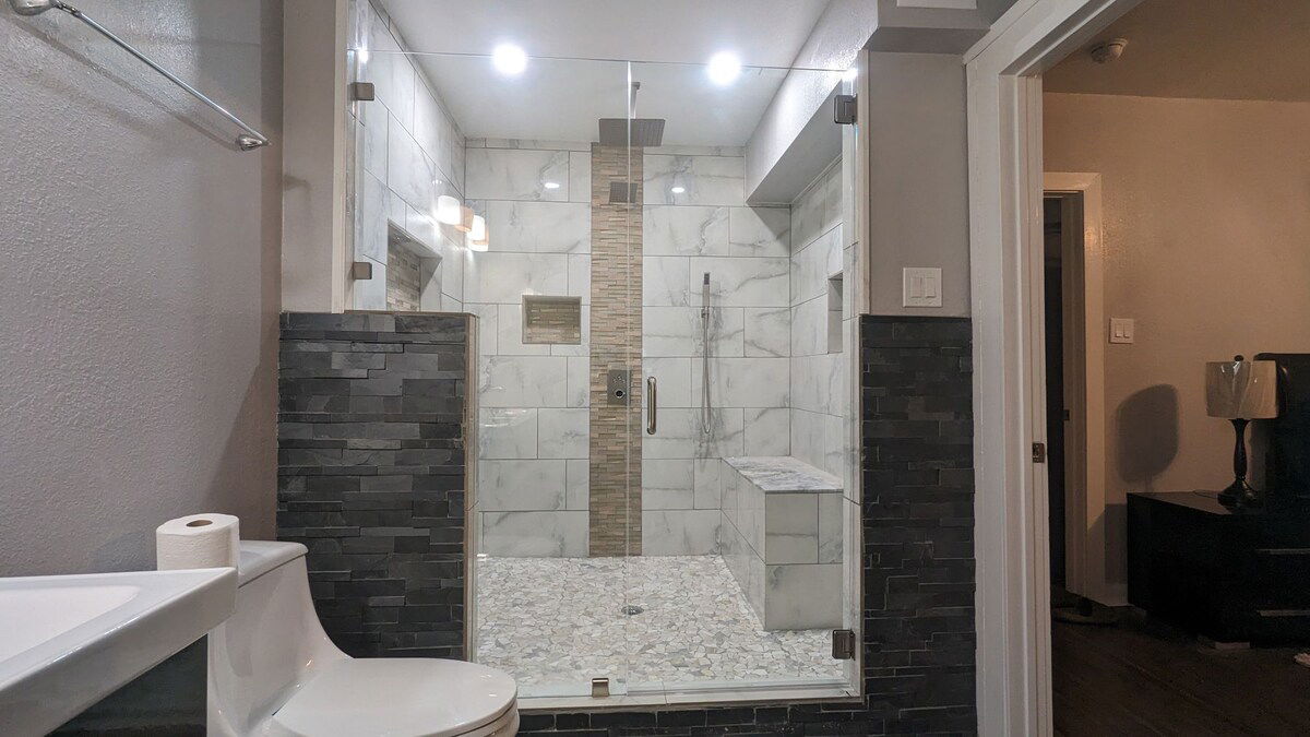 Willkommen in meinem zu Hause!!! Erlebe dieses 4-stöckige Containervilla im Herzen von Houston!!! Ich garantiere dir, dass du noch nie in einer solchen Unterkunft übernachtet hast. Nicht nur ein Gimmick, gefüllt mit zwei riesigen Küchen, privaten und Gemeinschaftsbädern auf jeder Etage, Lounge-Bereichen und einer Terrasse im 4. Stock mit Blick auf die Innenstadt von Houston!!! Dieser Raum: Privatsuite im Erdgeschoss mit Doppelwaschbecken und einer riesigen ebenerdigen Dusche!!! Voll möbliertes traditionelles Schlafzimmer mit Queensize-Bett, begehbarem Kleiderschrank und Fernseher.