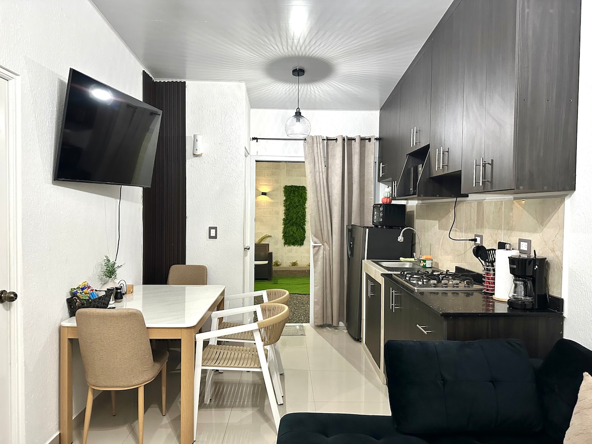 Komfortabler und gemütlicher Raum, ideal für kleine Familien bis zu 5 Personen mit allem, was du brauchst, in einer ruhigen und sicheren Wohngegend ohne Lärm, nur 2 Minuten vom Periférico Gerardo Barrios entfernt. Du hast Küchenutensilien, eine Küche mit Backofen, Mikrowelle, Kühlschrank, Waschmaschine, zwei komfortable Zimmer, ein komplettes Badezimmer und eine schöne Terrasse, Schlafsofa, TV und Highspeed-Internet bis zu 200 Mb. Garage für 2 Fahrzeuge, Gemeinschaftspool und Kinderpark.