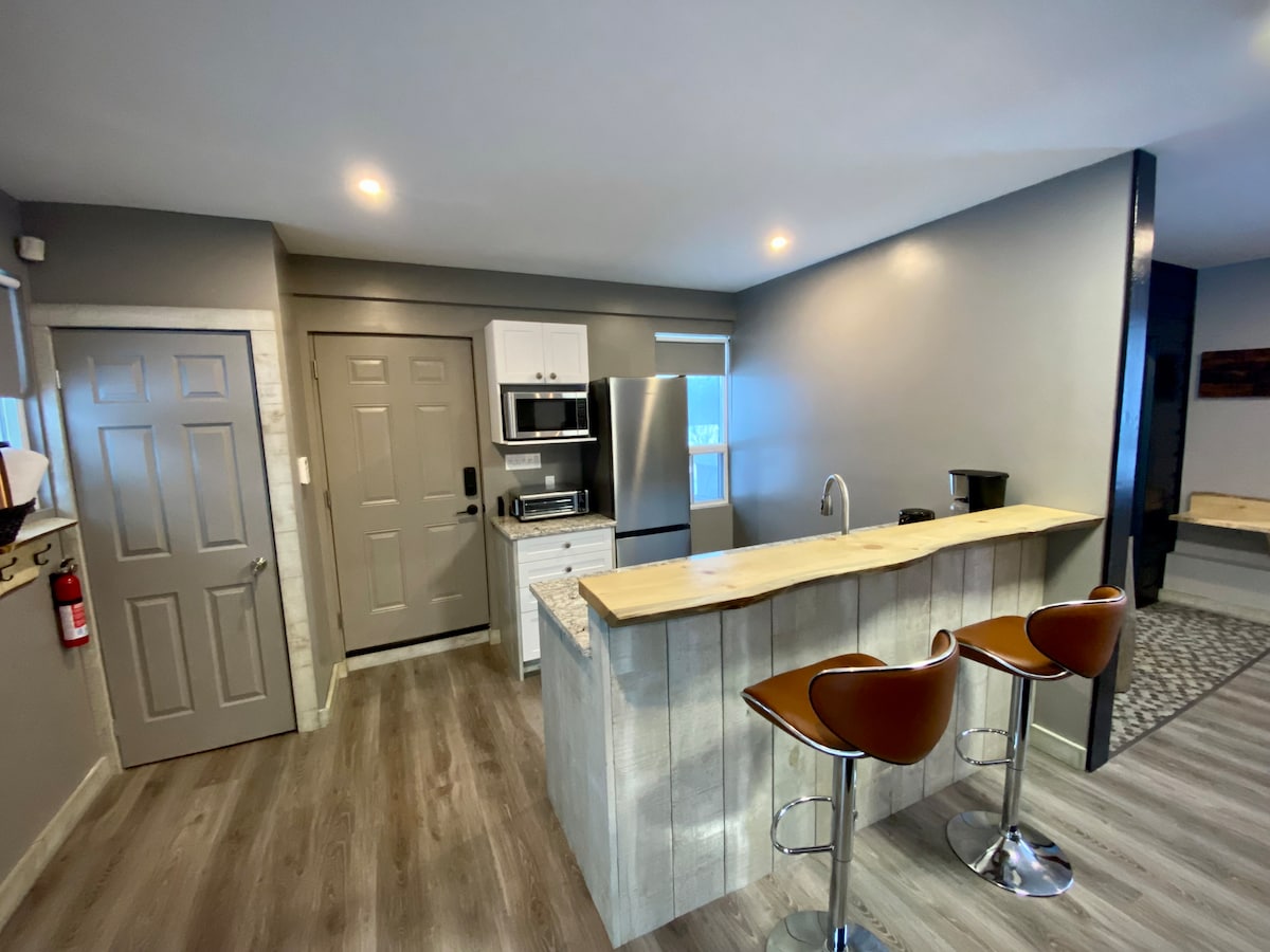 BITTE LESEN! Mt. St. Louis & Horseshoe Valley vor der Haustür! Dies ist eine helle, große und private GÄSTESUITE (Kellerwohnung). Whirlpool, Terrasse, Feuerstelle und abgelegener Waldweg, um die Natur zu genießen. Die Küche ist mit einem Induktionskochfeld und allen notwendigen Dingen ausgestattet, sogar einem Weinflaschenöffner :) Offenes Wohnzimmer/Küche/Esszimmer mit TV & Roku. Das Schlafzimmer ist ein Kunstwerk: dunkel, geheimnisvoll und romantisch! Maßgefertigtes Queensize-Bett aus verwittertem Scheunenholz, das von unserem Grundstück stammt.