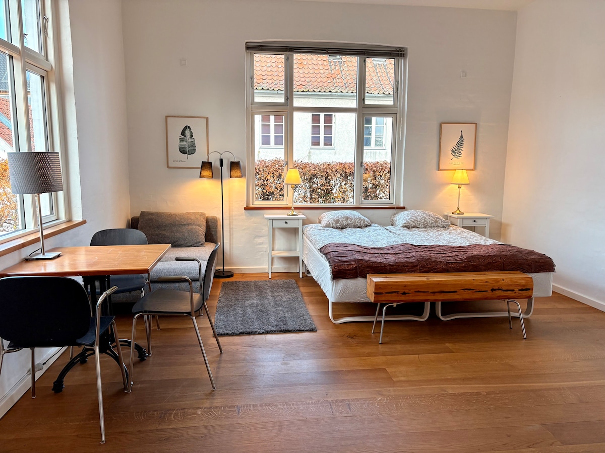 Die Wohnung befindet sich im gemütlichen historischen Stadtzentrum von Helsingör. Nur 5 Gehminuten vom Bahnhof, der Fähre nach Schweden, mehreren Restaurants, Lebensmittelgeschäften und Spezialläden entfernt. Eine Perle für Shopper und Stadtliebhaber. Der Küchenbereich ist groß und gut ausgestattet. Und das Homeoffice auch – einschließlich Highspeed-WLAN-Internetzugang. Das Bett ist oben – nicht leicht zugänglich für Menschen mit eingeschränkter Mobilität. Trotz der zentralen Lage ist die Wohnung überraschend ruhig.