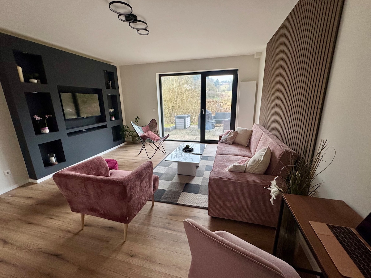 Panorama-Apartment, 60 m² – für bis zu 4 Gäste • Kingsize-Bett, Schlafsofa, Klappbett (auf Anfrage), Babybett • Voll ausgestattete Küche: Herd, Backofen, Wasserkocher, Kaffeemaschine, Geschirrspüler, Kühlschrank, TV • Hochwertige Bettwäsche, Handtücher, Kaffee und Tee • Große Terrasse mit Sonnenliege, Blick auf die Natur Tolle Lage: • 5 Minuten mit dem Auto / 30 Minuten zu Fuß zum Zentrum von Idstein • Wanderwege beginnen vor der Tür • 20 Minuten zum Flughafen Frankfurt und Wiesbaden • 2 km zur Autobahn • Spielplatz in der Nähe & Top-Grillrestaurant