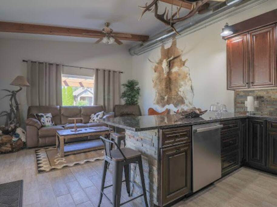 Come experience sleeping in a cave without actually roughing it! Located in the back of the Hobbit, the Cave has its own private entrance under the leaf canopied patio. *Please no smoking of any kind in our home or near the door *($250 fine)* You will be greeted by a lantern hanging among the stalactites and vines and a set of stairs leading down into the cave. An indoor gas fireplace, a 50" smart TV, full kitchen, tiled shower, & queen memory foam mattress all guarantees a magical stay!