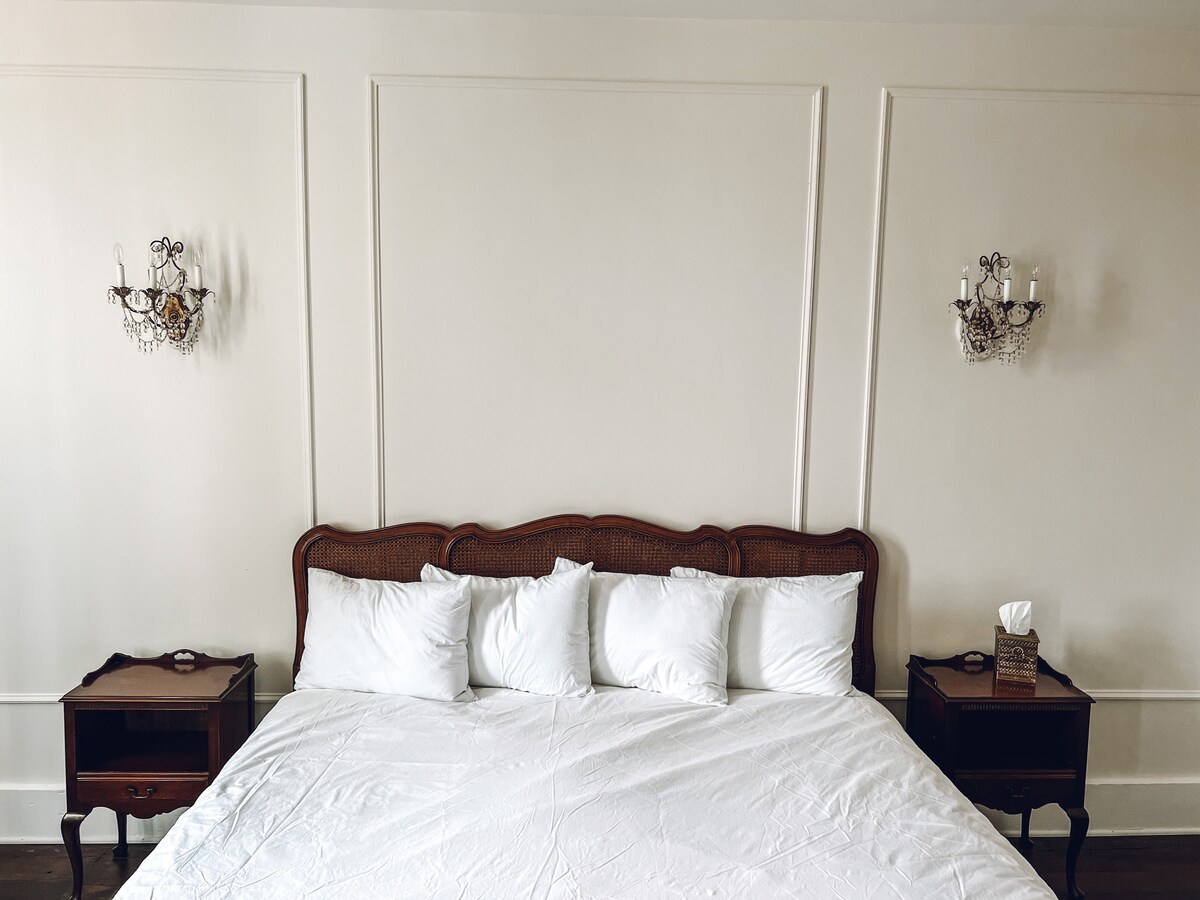 Modernes Hotelzimmer mit einem Schlafzimmer in einem komplett renovierten historischen Gebäude in der Innenstadt von Jacksonville. Alter Charme mit allen neuen Annehmlichkeiten. Regendusche, Kingsize-Bett, Arbeitsbereich, Smart-TV, kostenloses Highspeed-WLAN, kostenlose Parkplätze und Zugang zur schönen Innenstadt. Nur wenige Schritte von The Little Stove, einem italienischen Markt und einer Weinbar in der vorderen Hälfte des Gebäudes, entfernt.