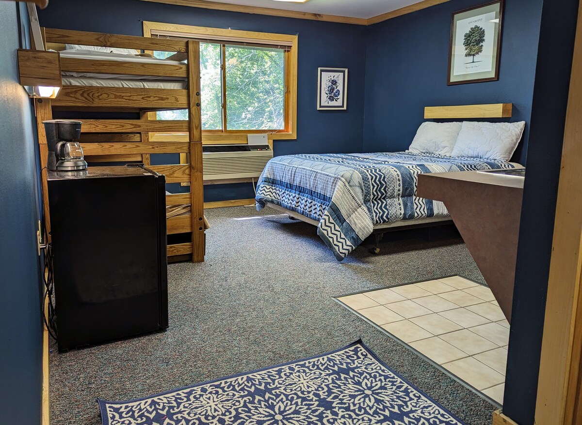 Bitte beachte, dass du möglicherweise einen Gemeinschaftsraum mit anderen teilst, wenn du das Zimmer einzeln buchst. Die Autumn House Lodge verfügt über 12 individuelle Zimmer im Hotelstil. Willkommen in der Autumn House Lodge, Heimat des Hackberry Room! Dieser gemütliche Raum ist mit allen Annehmlichkeiten ausgestattet, die du benötigst - von einem Queensize-Bett und zwei Etagenbetten mit einem Ausziehbett bis hin zu einer Küchenzeile mit Minikühlschrank, Mikrowelle und Kaffeemaschine.