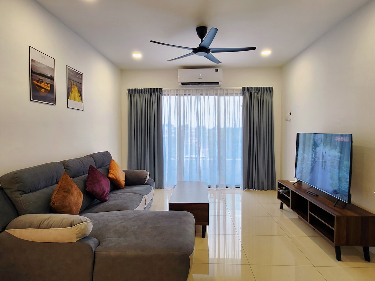 Eine komfortable Unterkunft mit dem eingebauten Wasserpark innerhalb der Wohnung. Die Eigentumswohnung ist gut ausgestattet mit dem Fitnessraum, Spielplatz und so weiter. Unsere Einheit ist gut renoviert mit Gemälden , Kochutensilien und nicht zu vergessen die Waschmaschine nicht, um sicherzustellen, dass Sie immer Kleidung zum Wechseln haben, besonders bei heißem Wetter. Unser Standort ist strategisch günstig und mit dem Einkaufszentrum AEON, Kopitiam (Hawker's Stand) erreichbar. Installiere GRAB für den Transport. Hinweis: WLAN ist jetzt verfügbar.