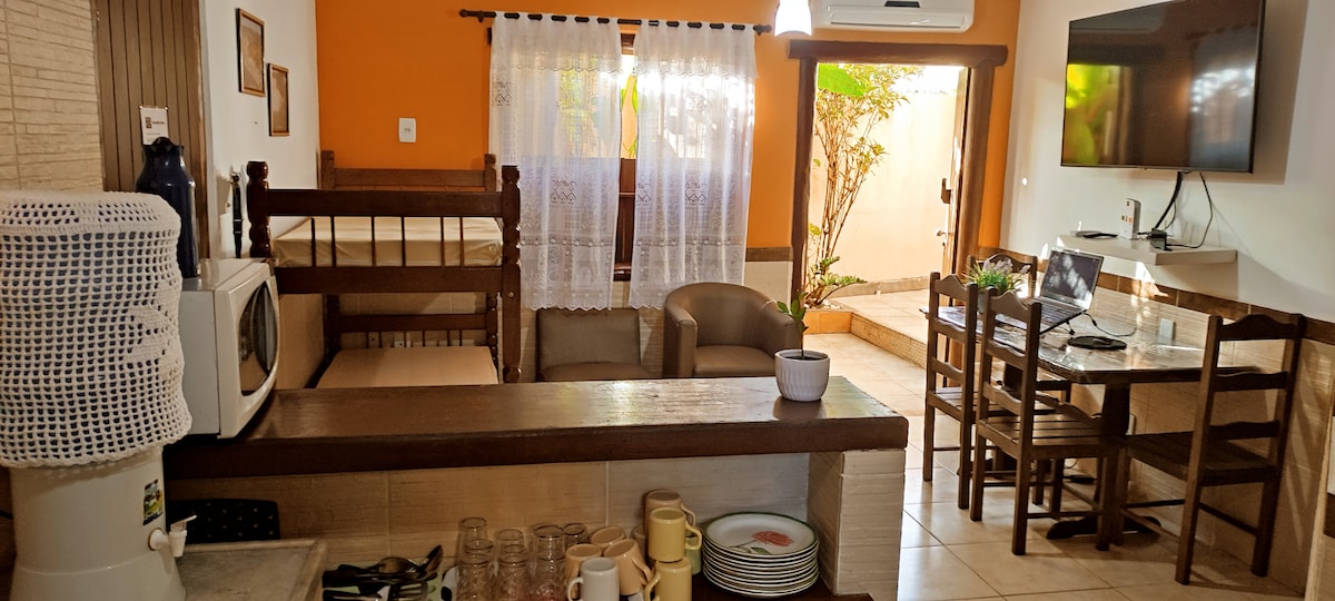 Das Residencial Recanto Tropical befindet sich in Arraial d'Ajuda - BA und ist eine Wohnanlage mit 3 renovierten und hochwertigen Häusern, umgeben von einheimischer Natur. Es liegt 50 Meter vom Strand von Araçaípe entfernt, am wunderschönen Meer von Bahia. Hier finden Sie eine familiäre, ruhige und gemütliche Atmosphäre, sowohl für die Erholung als auch für das Homeoffice. Das Haus Brisa do Mar bietet Platz für bis zu 3 Personen in 1 King-Size-Bett + 1 Einzelbett oder 3 Einzelbetten in diesem ruhigen und stilvollen Raum.