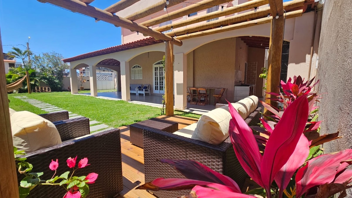 Großes Haus am Strand, gut gelegen, mit 4 Suiten mit Klimaanlage und Ventilator und einem weiteren Schlafzimmer, riesigem Wohnzimmer, geräumigem Balkon mit Grill, Grünfläche für Sport und hat einen Parkplatz auf der Seite auf der Rückseite des Hauses. Neben einem Platz, der für Homeoffice geeignet ist. Bring die ganze Familie mit zu diesem tollen Ort mit viel Platz für Spaß.