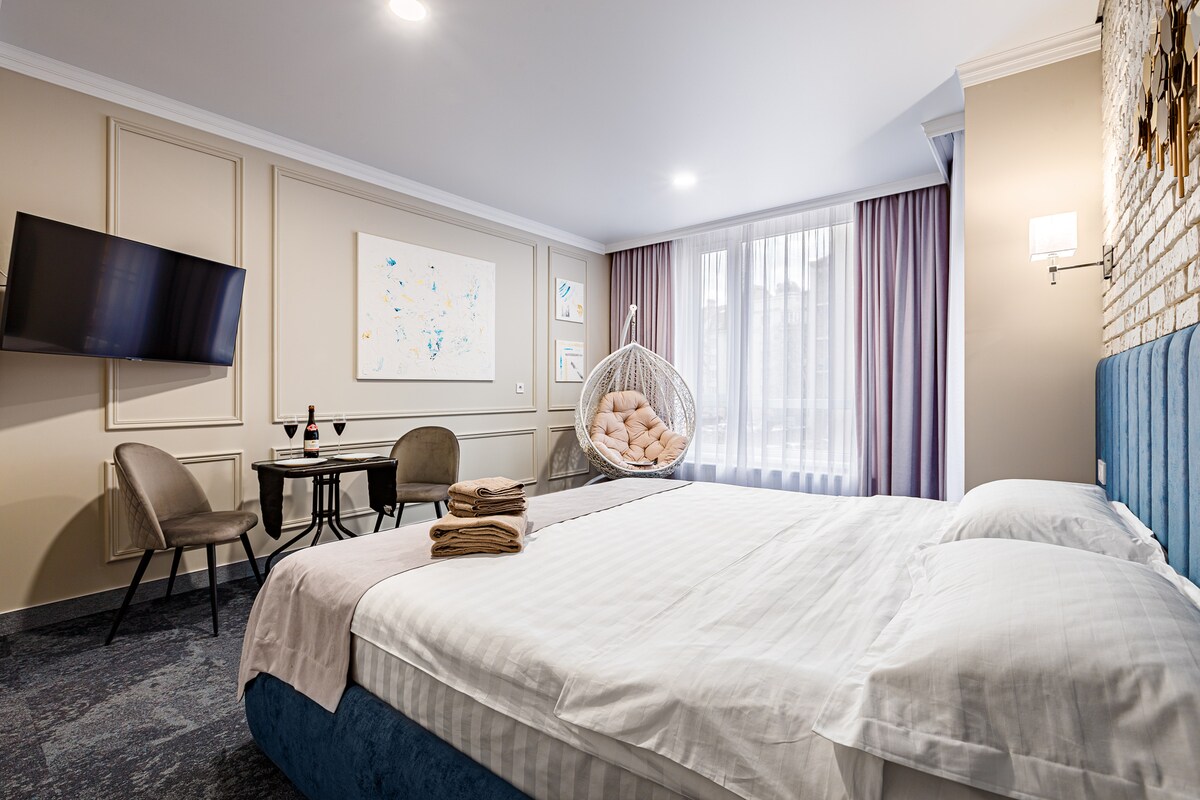 Ідеальне розташування у тихому дворику центральної вулиці – стометрівки. Ратуша – за 5 хвилин ходьби. Кафе - Десятка, Delikacia, Urban Space, Familiya - до 2 хвилин. У кожному номері двоспальне ліжко з ортопедичним матрацом розміру queen-size, смарт ТВ з іграми на Android, кондиціонер, Wi-FI, Netflix, кавовий столик. При потребі є робочий стіл. На кухні є чайник, холодильник, плита, посуд та питна вода. На кожні три номери загальний душ та туалет збоку від номера у коридорі. Усього 9 номерів