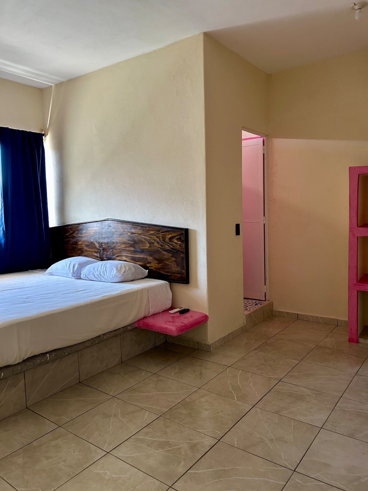 The space is a large room with two queen size beds, a dresser with a mirror and private bathroom with a spacious dressing room. The rooms are in quiet zone, 15 minutes walking to Zihuatanejo's dowtown and the beach. At the entrance there is a restaurant, that also has a open space.