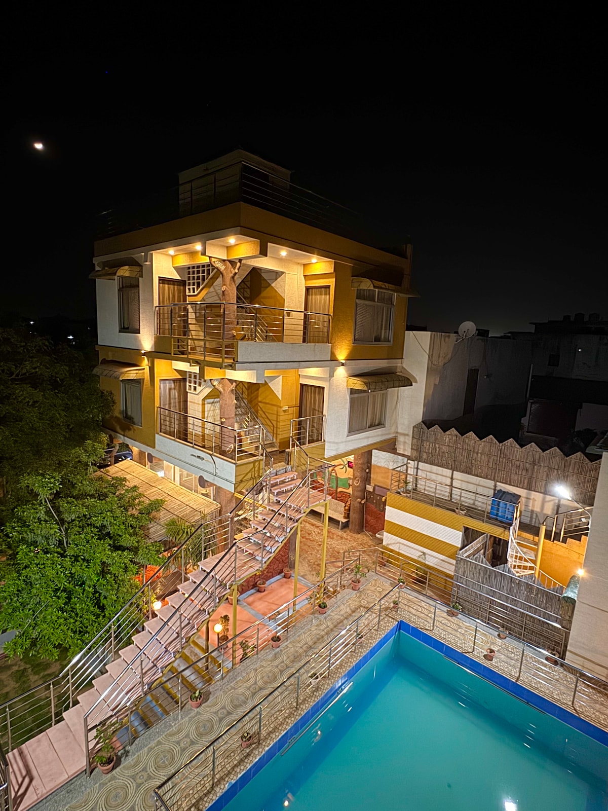 Tritt ein in eine 4-Bett-Villa, die unkonventionellen Charme und den entspannten Luxus ausstrahlt. Ein Layout im Innenhof umgibt einen schillernden Pool. Drei vielseitige Zimmer verfügen über Kingsize-Betten; eines bietet zwei Zimmer mit eigenem Bad. Nur 10 Minuten von Vaishali Nagars lebhaften Cafés und schicken Bars entfernt, verfügt die Villa über einen 75-Zoll-Smart-TV, Bose-Lautsprecher, Innen-/Außenbars, einen 1200 Quadratfuß großen Wohnbereich und eine kuratierte Küche. Genieße täglich rund um die Uhr Housekeeping, optionalen Kochservice und nahtlose Zomato- und Blinkit-Lieferungen.