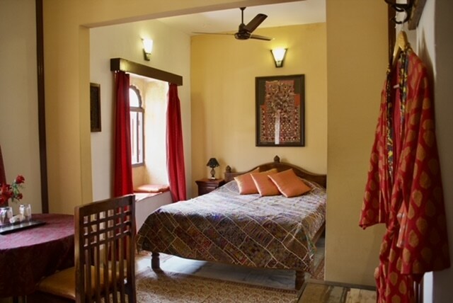 A chance to stay In inside fort historical place 450year old Haveli view of city and lake atteched bath double bed room with hallow stone wall decorated with old Entique get the healed in haveli