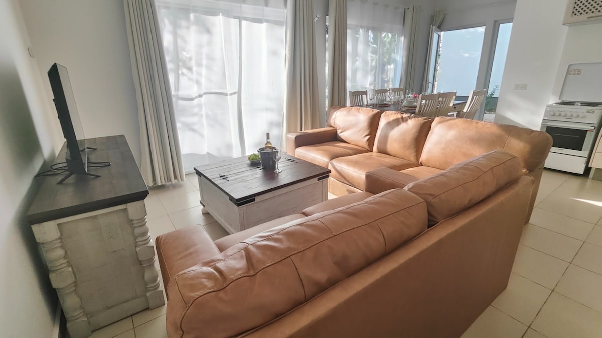 Our villa has 3 En-suite Bedrooms, all equipped with TV, cable, air conditioning, a ceiling fan, and hot water, along with one Deluxe Bedroom with a walk-in wardrobe for added comfort. Enjoy a spacious living room, dining area, modern kitchen, and extra public bathroom. Located in a gated property with an electric fence, we offer free parking. The villa doesn’t offer a generator. Airport pickup $20 (5–10 min drive). Local Shops and supermarket nearby.
