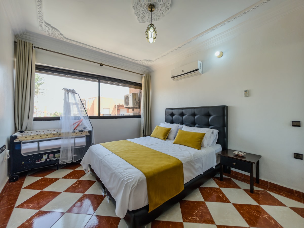 Eine elegante und neue Wohnung in einer der sichersten Gegenden in der Nähe aller Annehmlichkeiten (Metzgerei, Lebensmittelgeschäft, Snacks und Restaurants), 2 Minuten von der medizinischen Fakultät und nur einen Katzensprung von Guéliz (5 Minuten) entfernt * Ausgestattet mit einem luxuriösen modernen Wohnzimmer. * Ein 50-Zoll-Fernseher mit Satellitenkanälen, Netflix, Youtube... * GLASFASER mit 100 Mbit/s. * Eine voll ausgestattete Küche. * Ein geräumiges Zimmer mit Terrasse. * Zentrale Klimaanlage. * Sehr sauberes Gebäude mit eigenem Parkplatz im Untergeschoss.