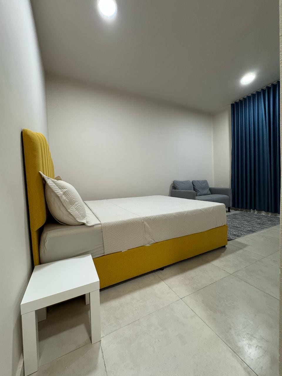 A modern studio with a refined design offering comfort and privacy, featuring smart self check-in. Includes a king-size bed, elegant seating, massage chair, full kitchen, and a luxurious bathroom with Jacuzzi. Hotel-style cleaning is available upon request. Smart use of space, stylish furniture and calming touches. Located 5 mins from Jeddah Airport. Fast Wi-Fi, 75” TV, free Netflix. Quiet building with elevator and private parking. Everything you need for a perfect stay.