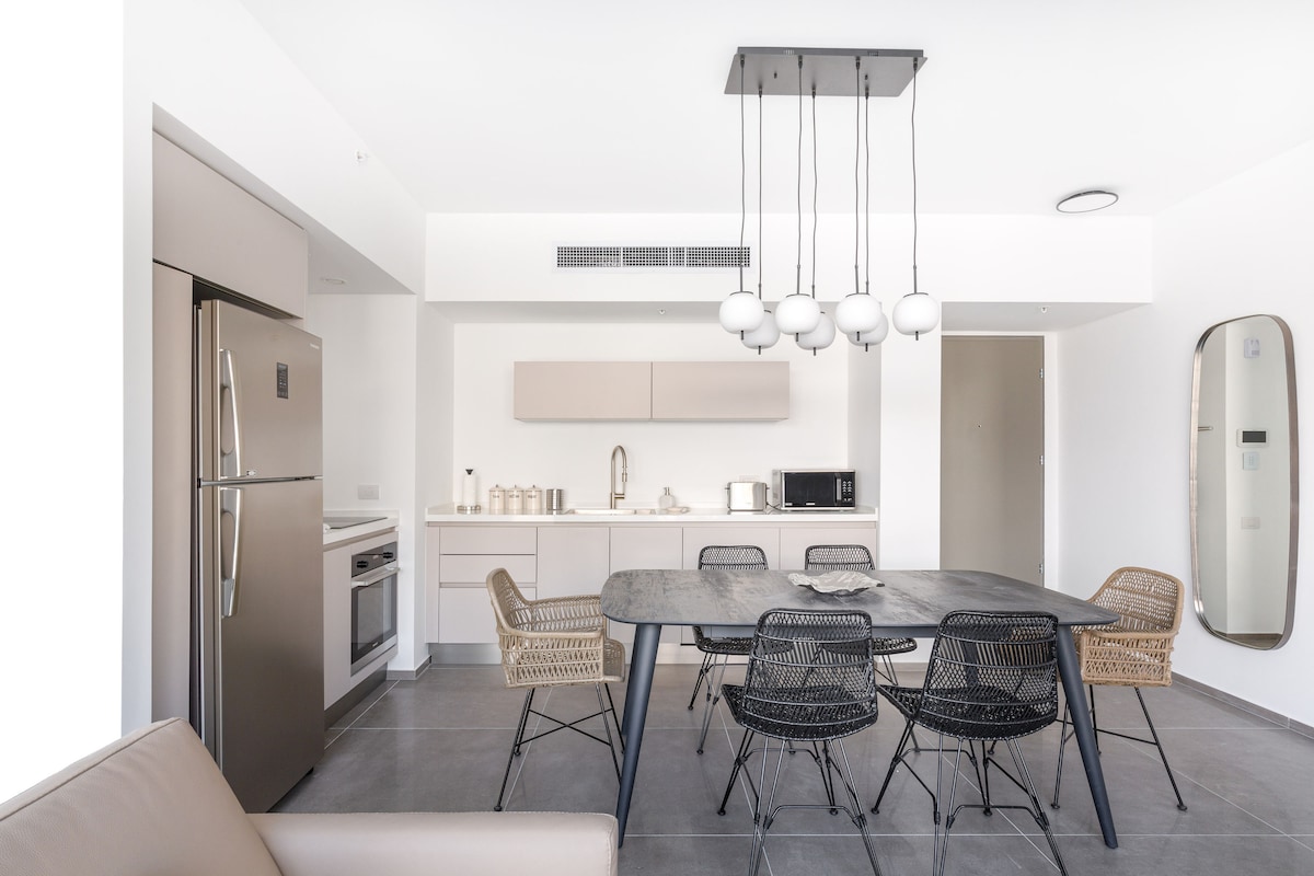 Wir bieten mehrere identische Wohnungen im Gebäude an! Das Hotel liegt in einem brandneuen Wohnprojekt, nur wenige Schritte vom Strand und der berühmten TLV Promenade entfernt. Trete aus dem Gebäude in die beste Lage in Israel! Die Wohnung blickt von fast jedem Fenster auf das Meer. Es gibt 2 geräumige Schlafzimmer, Schränke, Stehdusche, große Badewanne, ein verwöhnendes Wohnzimmer mit Smart-TV, eine voll ausgestattete Küche, einen Geschirrspüler, Nespresso, einen Essbereich, eine Klimaanlage, eine Waschmaschine, einen Trockner und vieles mehr! Parkplatz enthalten!