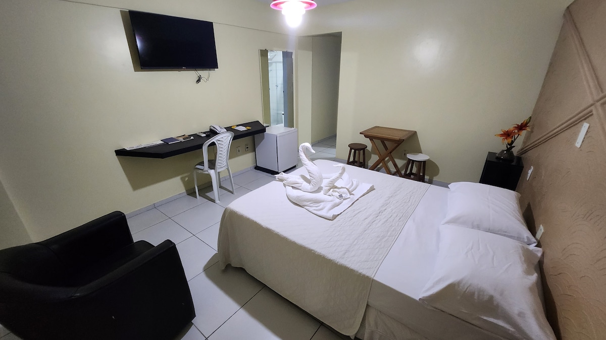 Komfortable 17 m² große Suite, ausgestattet mit Klimaanlage, elektrischer Dusche, Doppelbett, Minibar, Stuhl, Kabel-TV und Streaming, Kleiderschrank mit Kleiderbügeln. Gut gelegen, am Meer von João Pessoa, neben dem Einkaufszentrum Mag und in der Nähe des Einkaufszentrums Manaíra, auch in der Nähe von Bars, Restaurants, Eiscreme, Bäckerei, großartiger Ort zum Wandern am Strand oder der Promenade von Manaíra.